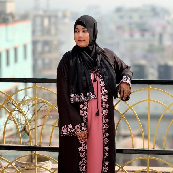 The front of the abaya features a dainty tie-closure, allowing you to adjust the fit while adding a charming detail to the neckline. The lightweight, flowing fabric makes it an excellent choice for warmer climates or long events where comfort is a priority. Included with the abaya is a premium black hijab that frames the face beautifully and highlights the pink accents of the gown. Whether it’s a family gathering or a special night out, this abaya provides a modest, stylish, and comfortable solution for any fashion-forward woman.