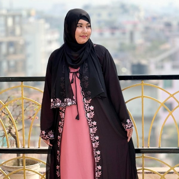 Embrace feminine charm with this Rosewood pink and Black layered abaya. Featuring delicate pink floral embroidery and a stylish tie-front detail, this abaya offers a soft, romantic look paired with a classic black hijab for contrast.