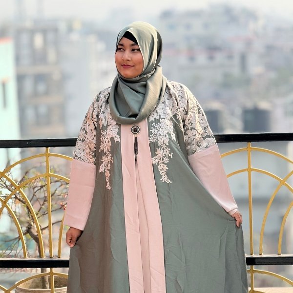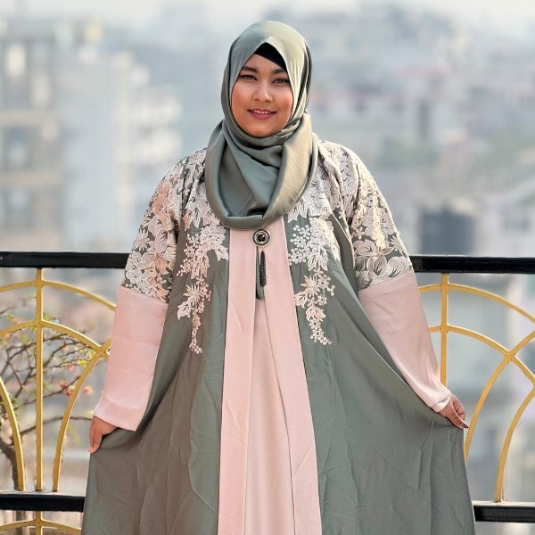 Elevate your modest wardrobe with our Sage & Blush Floral Embroidered Abaya. This exquisite piece combines a refreshing sage green outer layer with a soft blush pink inner panel, creating a harmonious and feminine aesthetic. The highlights of this garment are the beautifully detailed white floral embroidery patterns cascading over the shoulders and upper bodice, adding a touch of artisanal luxury.